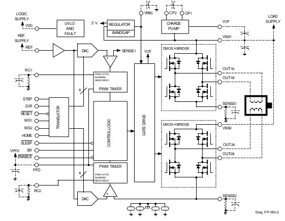 The A3977SLP is a complete microstepping motor driver with built-in translator. They are designed to operate bipolar stepper motors full-, half-, quarter-, and eighth-step modes, with output drive capability of 3V and ±2.5 A. The A3977 includes a fixed off-time current regulator that ha the ability to operate in slow-, fast-, or mixed-decay modes. This current decay control scheme results in reduced audible motor noise, increased step accuracy, and reduced power dissipation.The translator is the key to the easy implementation of the A3977.